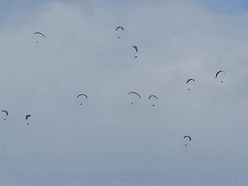 帰り道、登った山を振り替えると、たくさんのパラグライダーが飛んでいます。
